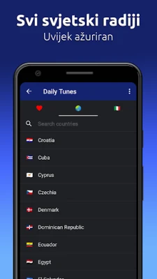 Uronite u svijet zvuka s Daily Tunes - Hrvatski i svjetski internetski radio, elegantnom aplikacijom koja redefinira vaše iskustvo slušanja. S pažnjom dizajniranom za besprijekornu upotrebu na vašem mobilnom telefonu ili tabletu, ova platforma donosi najbolje hrvatske i globalne internetske radio stanice izravno na dohvat ruke. Naša filozofija 'Manje je više' očituje se u intuitivnom sučelju koje stavlja naglasak na jednostavnost i funkcionalnost, osiguravajući da je vaša omiljena glazba i program uvijek samo dodir daleko. Redovita ažuriranja osiguravaju da je vaša zbirka postaja uvijek svježa i spremna za slušanje.
