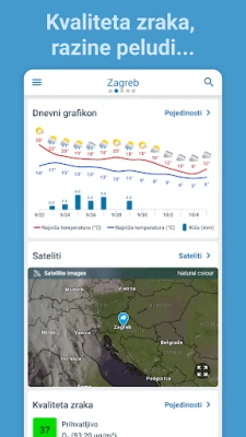 Zaronite dublje u analizu vremena uz interaktivne karte i vizualizacije. Naš napredni radar za oborine omogućuje vam praćenje kiše i snijega u stvarnom vremenu s izvanrednom preciznošću. Prelistajte prognostičke slojeve koji prikazuju temperaturu, oborine, tlak zraka, a sve obogaćeno animacijama čestica za jasan uvid u smjer vjetra i valova. Uz satelitske snimke za posljednjih 12 sati, dobivate sveobuhvatnu sliku razvoja vremenskih uvjeta. Dodatno, nećete se morati brinuti o iznenadnim promjenama, jer ova aplikacija isporučuje službena upozorenja Državnog hidrometeorološkog zavoda (DHMZ) te drugih globalnih pružatelja, osiguravajući da ste uvijek obaviješteni o ekstremnim situacijama u vašoj blizini. Pratite i detaljne informacije o kvaliteti zraka te uvjetima važnima za osobe s alergijama, uz grafičke prikaze izlaska/zalaska sunca i mjesečevih faza za ljubitelje prirode.